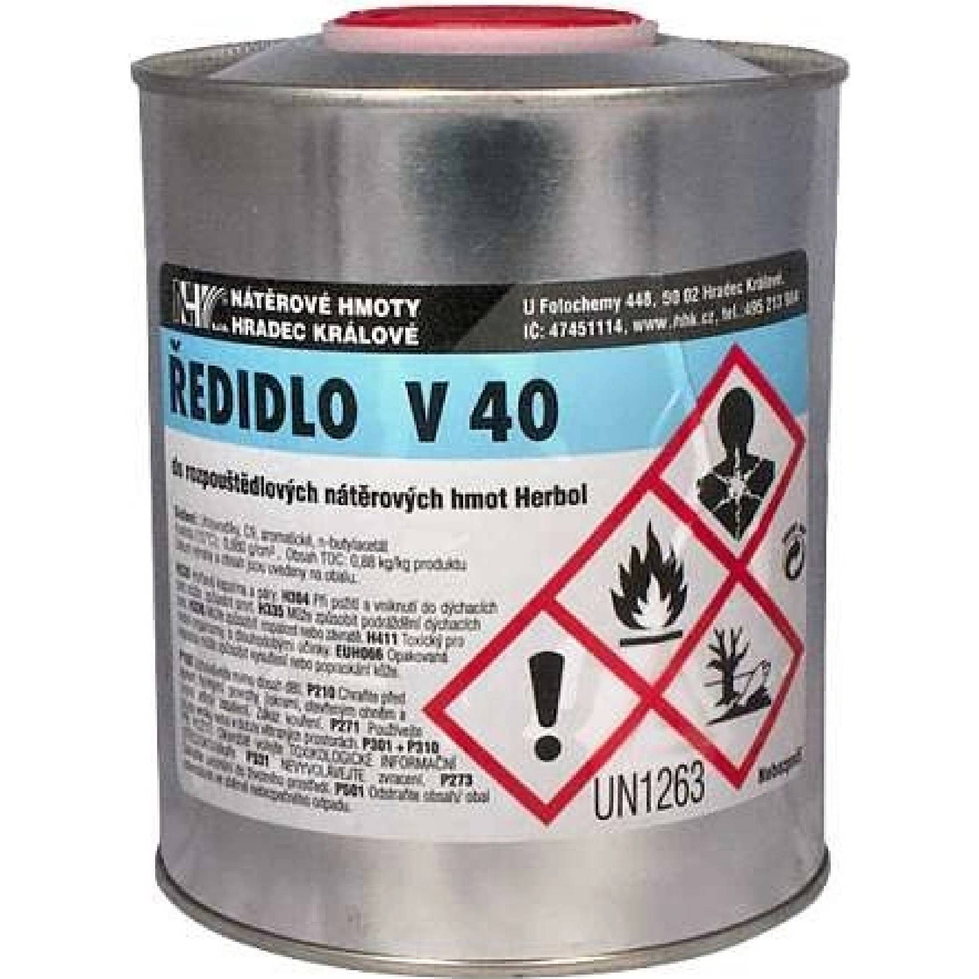 Vysoce kvalitní ředidlo V 40 (Kunstharz-Verdünnung) je určené pro syntetické nátěrové hmoty Herbol. Používá se pro ředění nátěrů připravených k nanášení štětcem a válečkem, případně k čištění použitého nářadí. Není vhodné k ředění barev určených ke stříkání.