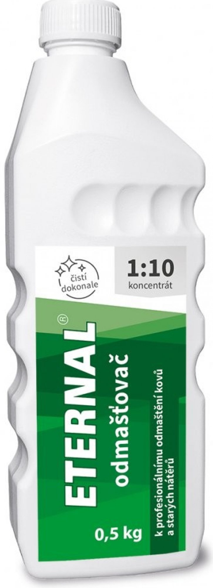 ETERNAL odmašťovač se před použitím ředí vodou (nejlépe měkkou až středně tvrdou 0,7–2,5 mmol/l) na 5 %–15 % roztok (tj. 1:20 až 3:20).
