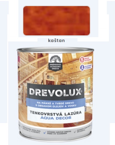 DREVOLUX AQUA DECOR je vodou ředitelná tenkovrstvá olejová lazura na dřevo s obsahem vosku. Je vhodná k nátěrům dřevěných dekoračních předmětů, obkladů, zábradlí, dřevěného interiérového a zahradního nábytku, altánů, laviček, plotů a jiných stavebně-truhlářských výrobků ze dřeva. Povrch ošetřeného dřeva je hedvábně matný, příjemný na dotek a vodoodpudivý. Lazura účinně penetruje do hloubky, chrání dřevo před stárnutím, oddaluje následky působení vlhkosti, UV záření a povětrnostních vlivů, nepraská a neodlupuje se. Zachovává přirozenou strukturu dřeva a zvýrazňuje jeho kresbu. Je vhodná pro nové i renovační nátěry.