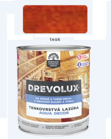 DREVOLUX AQUA DECOR je vodou ředitelná tenkovrstvá olejová lazura na dřevo s obsahem vosku. Je vhodná k nátěrům dřevěných dekoračních předmětů, obkladů, zábradlí, dřevěného interiérového a zahradního nábytku, altánů, laviček, plotů a jiných stavebně-truhlářských výrobků ze dřeva. Povrch ošetřeného dřeva je hedvábně matný, příjemný na dotek a vodoodpudivý. Lazura účinně penetruje do hloubky, chrání dřevo před stárnutím, oddaluje následky působení vlhkosti, UV záření a povětrnostních vlivů, nepraská a neodlupuje se. Zachovává přirozenou strukturu dřeva a zvýrazňuje jeho kresbu. Je vhodná pro nové i renovační nátěry.