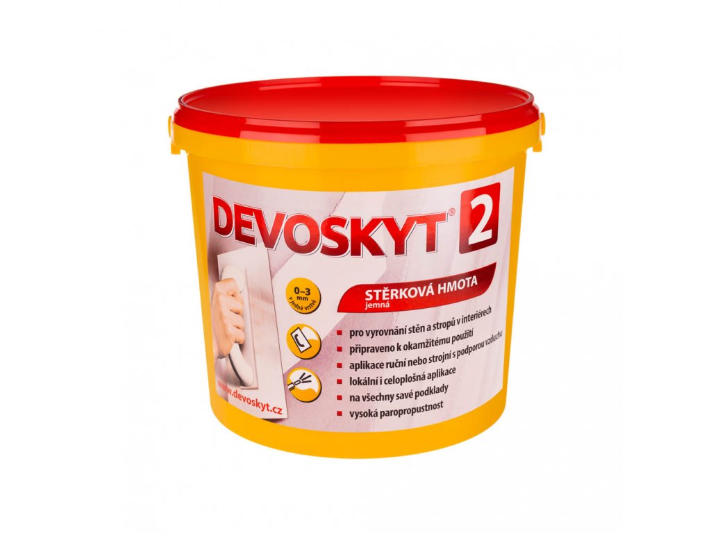 Stěrková hmota Devoskyt je určena k povrchovým úpravám stěn a stropů v interiérech. Je připravena k okamžitému použití. Devoskyt je vynikající podklad pro malování, tapetování a veškeré dekorační techniky.