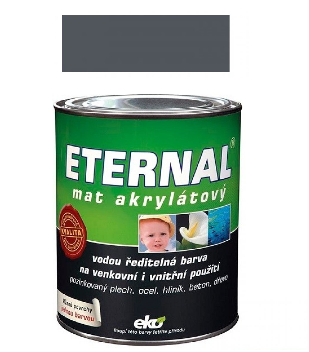 ETERNAL mat akrylátový je hedvábně matná akrylátová vodou ředitelná barva pro venkovní i vnitřní použití. Je určena k novým i udržovacím nátěrům pozinkovaného plechu (i bez předchozí oxidace), oceli opatřené antikorozním základním nátěrem, hliníku (přilnavost nutno předem ověřit). Lze jej použít i k nátěrům nepochozího betonu, mědi, nepochozího dřeva, neglazované keramiky a dalších stavebních materiálů.
