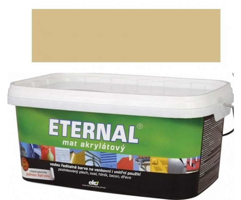 ETERNAL mat akrylátový je hedvábně matná akrylátová vodou ředitelná barva pro venkovní i vnitřní použití. Je určena k novým i udržovacím nátěrům pozinkovaného plechu (i bez předchozí oxidace), oceli opatřené antikorozním základním nátěrem, hliníku (přilnavost nutno předem ověřit). Lze jej použít i k nátěrům nepochozího betonu, mědi, nepochozího dřeva, neglazované keramiky a dalších stavebních materiálů.
