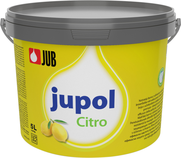 JUPOL CITRO je vnitřní malířská barva, vyrobená na základě vodní disperze polymerních pojiv. Je určena především k dekorativní ochraně stěn a stropů v prostorech, kde z důvodu vysoké relativní vlhkosti vzduchu je velká pravděpodobnost vzniku kondenzátu, a tedy i vzniku plísní v koutech, za skříněmi a jinde. Doporučujeme ji zejména do kuchyní, koupelen, prádelen, spíží a podobných prostor v obytných a firemních objektech, školách, školkách, hotelech, nemocnicích, domovech důchodců a jiných veřejných a průmyslových objektech, v nichž u nátěru není požadována omyvatelnost neboli odolnost proti oděru za mokra. Vhodným podkladem jsou omítky různých druhů, povrchy vyrovnané různými vyrovnávacími hmotami, reliéfní papírové tapety, ale i sádrokartonové a vláknocementové desky, dřevotřísky neomítnutý beton apod. Možné je i nanášení na starší pevné disperzní nátěry a dobře držící dekorativní omítky různých druhů.