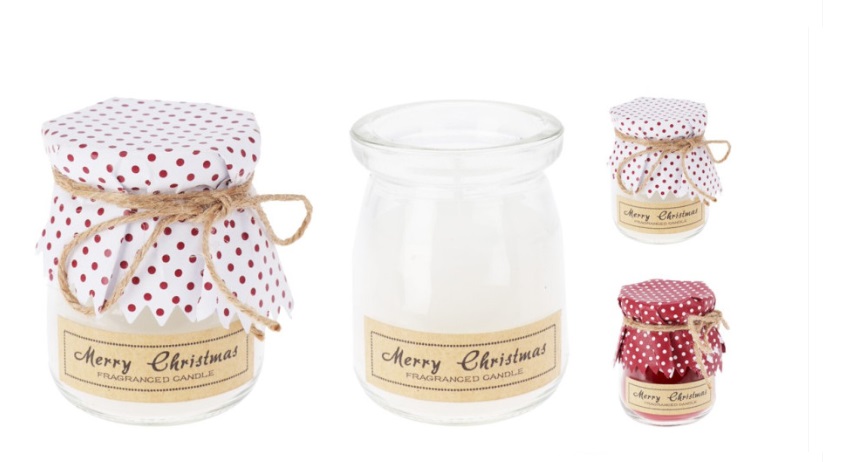 - Svíčka ve skle 55x70mm vonná s papírovým tištěným víčkem, Merry Christmas mix, bílá, červená