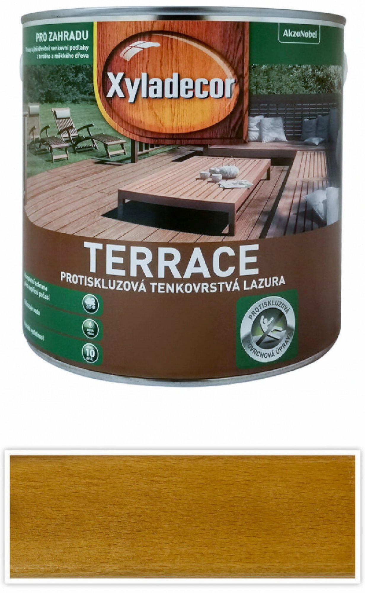 Xyladecor Terrace je ochranná tenkovrstvá lazura na rozpouštědlové bázi speciálně vyrobena pro ochranu venkovních dřevěných podlah. Krémová konzistence produktu ulehčuje aplikaci a lépe se roztírá. První vrstva vniká do struktury dřeva a impregnuje, čímž zajišťuje dlouhodobou ochranu. Druhá vrstva zanechává na povrchu protiskluzový film v podobě mikrogranulí. Výrobek je šetrnější k životnímu prostředí. Vytváří mikroporézní saténový povrch, který chrání proti UV záření a nepřízním počasí. Výrobek je vhodný na venkovní podlahy vyrobené z tlakově impregnovaného dřeva, tvrdého a měkkého dřeva nebo dřeva již ošetřeného impregnačním prostředkem.