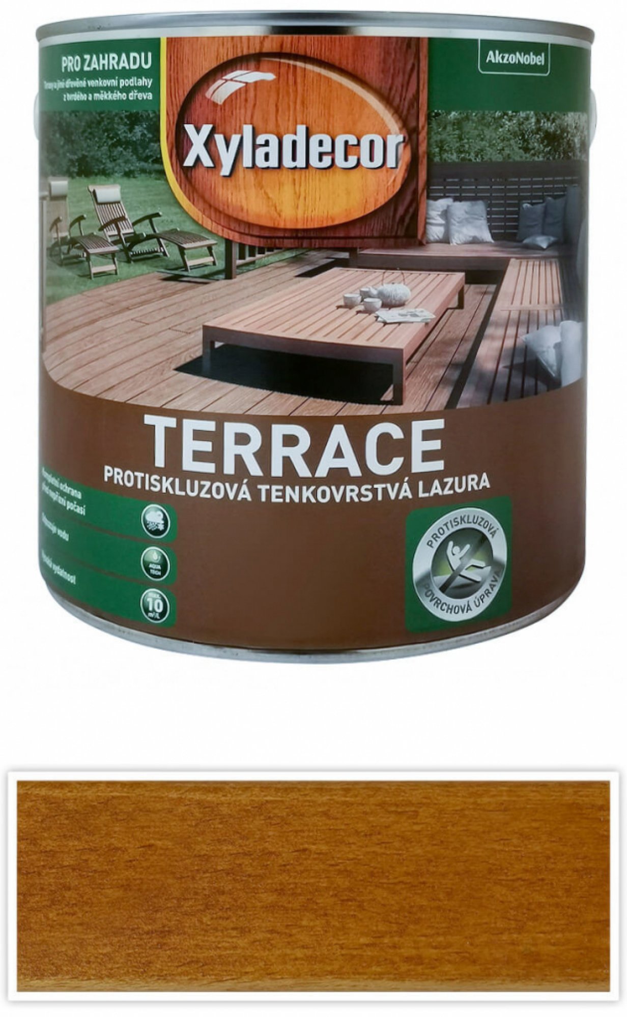 Xyladecor Terrace je ochranná tenkovrstvá lazura na rozpouštědlové bázi speciálně vyrobena pro ochranu venkovních dřevěných podlah. Krémová konzistence produktu ulehčuje aplikaci a lépe se roztírá. První vrstva vniká do struktury dřeva a impregnuje, čímž zajišťuje dlouhodobou ochranu. Druhá vrstva zanechává na povrchu protiskluzový film v podobě mikrogranulí. Výrobek je šetrnější k životnímu prostředí. Vytváří mikroporézní saténový povrch, který chrání proti UV záření a nepřízním počasí. Výrobek je vhodný na venkovní podlahy vyrobené z tlakově impregnovaného dřeva, tvrdého a měkkého dřeva nebo dřeva již ošetřeného impregnačním prostředkem.