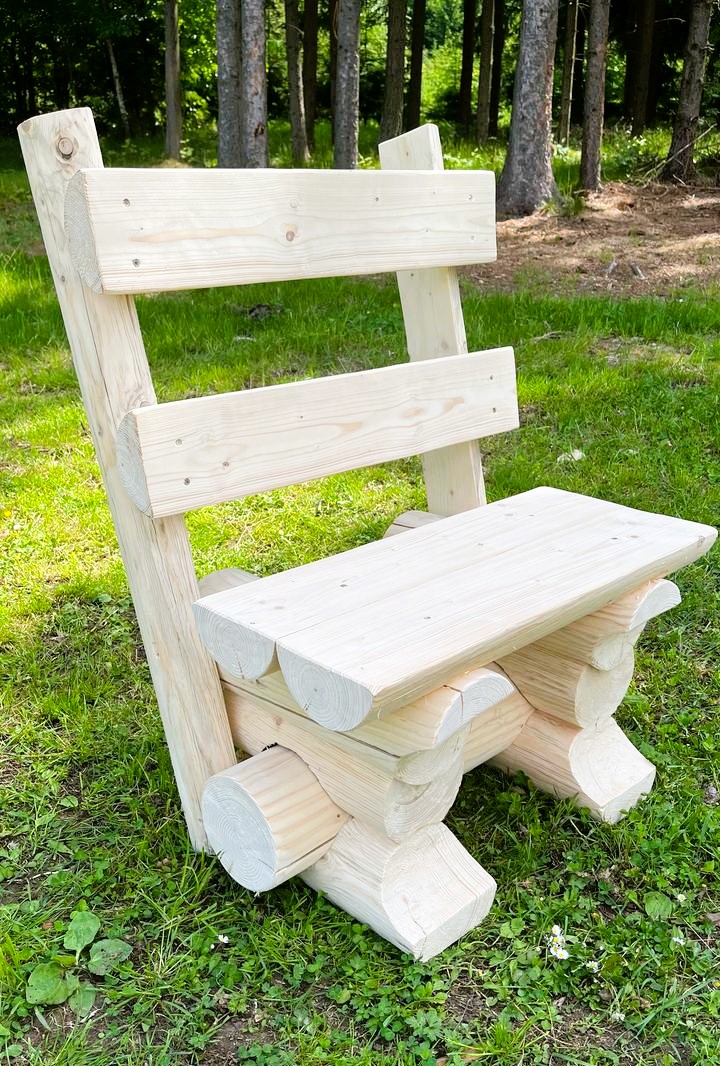 Masivní dřevěná židle z přírodní kulatiny, umístěná na travnaté ploše u lesa. Sedák i opěradlo jsou vyrobeny z hladce opracovaných smrkových kulatin, které zůstaly ve svém přirozeném světlém odstínu. Konstrukce působí stabilně, robustně a esteticky vyváženě. Díky jednoduchému, ale pečlivě provedenému designu židle skvěle ladí s přírodním prostředím kolem.