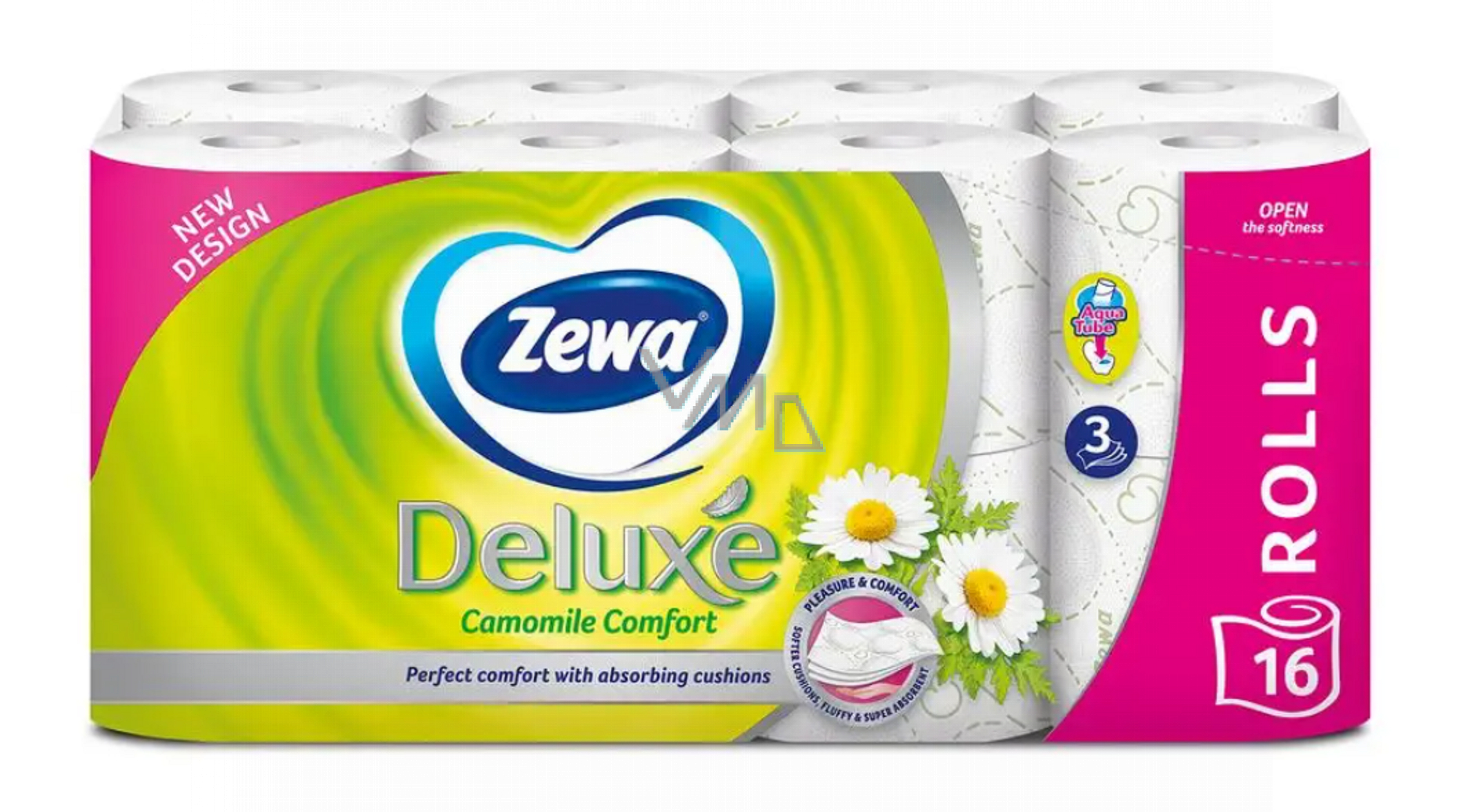 ZEWA Deluxe Camomile Comfort je bílý třívrstvý toaletní papír který je potištěn příjemným zeleným vzorem a voní po heřmánku I díky tomu se stal tak oblíbeným v našich domácnostech i kancelářích Tři vrstvy toaletního papíru poskytují extra jemnost a pevnost Roličky AquaTube z tohoto toaletního papíru ZEWA mohou být pohodlně vhozeny do toalety a spláchnuty kde se snadno rozpustí Řada Deluxe je navíc vyráběna z recyklovaného papíru